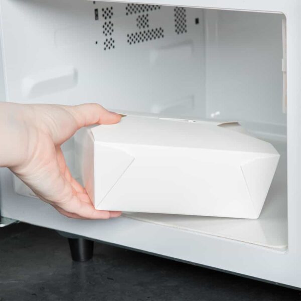 One of the most popular types of delivery and takeout food packaging. The #8 (45 oz) white, paper folded carton is made from SBS paperboard, making it perfect for hot or cold food. Their poly-coated interior is designed to prevent grease and oil from soaking through, while their secure foldable design prevents annoying spills and messes. These containers are 100% recyclable allowing you to impress your customers with your commitment to green packaging!nn